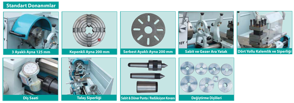 3-jaw chuck Ø 125 mm, 4-jaw chuck Ø 200 mm, Flat chuck 200 mm, Steady rest, Follower rest, MK3 live center, MK3 dead center, Reducer cone MK5/MK3, thread adjustment, 4 way tool post, halogen lamb, changeable threads, Foot padel, Cooling System, Toolkit.