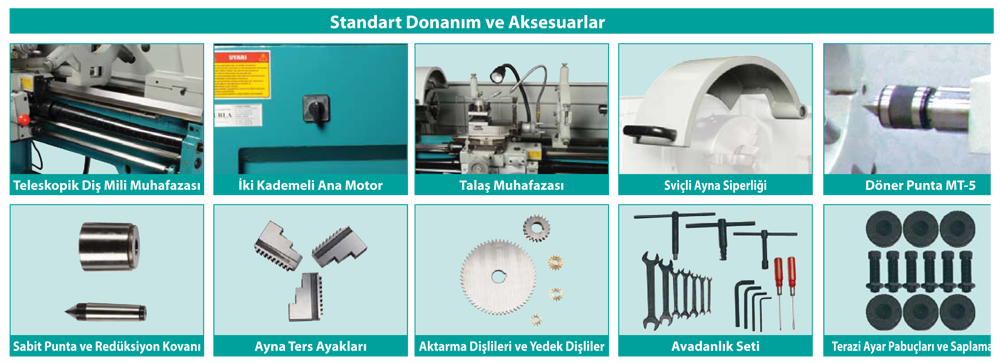 3-jaw chuck Ø 200 mm, 4-jaw chuck Ø 250 mm, Flat chuck 350 mm, Steady rest, Follower rest, MK3 live center, MK3 dead center, Reducer cone MK5/MK3, thread adjustment, 4 way tool post, halogen lamb, changable threads, Foot padel, Cooling System, Toolkit.