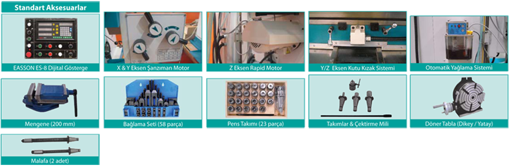 Dijital gösterge, X & Y Eksen şanzıman motor, Z eksen rapid motor, Y/Z eksen kutu kızak sistemi, Otomatik yağlama sistemi, Mengene, Bağlama seti, Pens takımı, Takımlar & Çektirme mili, Malafa, Döner tabla.