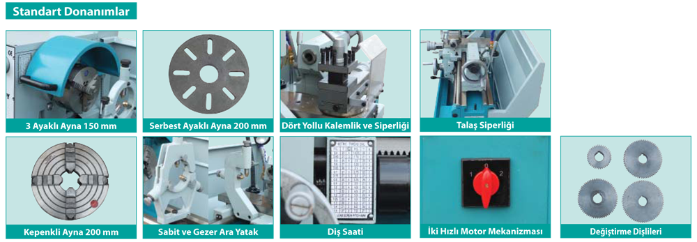 3 ayaklı ayna, Serbest ayaklı ayna, Dörtyollu kalemlik ve siperliği, Talaş siperliği, Kepenkli ayna, Sabit ve gezer ara yatak, Diş saati, İki hızlı motor mekanizması, Değiştirme dişlileri