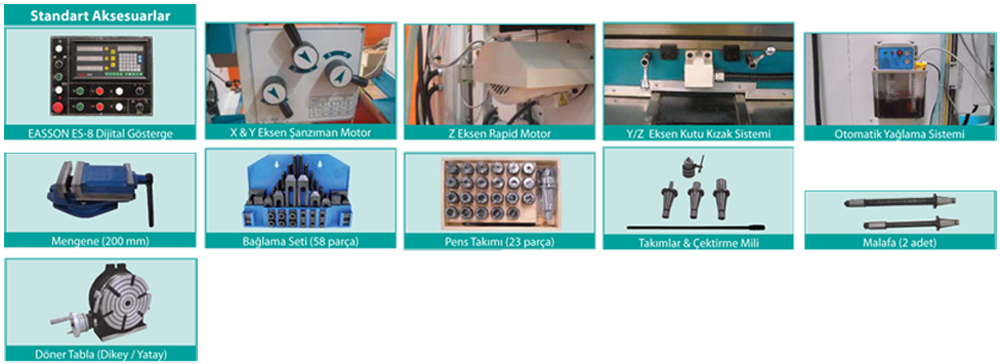 Dijital gösterge, X & Y Eksen şanzıman motor, Z eksen rapid motor, Y/Z eksen kutu kızak sistemi, Otomatik yağlama sistemi, Mengene, Bağlama seti, Pens takımı, Takımlar & Çektirme mili, Malafa, Döner tabla.