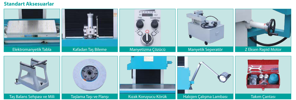 Elektromanyetik tabla, Kafadan taş bileme, Manyetizma çözücü, Manyetik seperatör, Z eksen rapid motor, Taş balans sehpası ve mil, Taşlama taşı ve flanşı, Kızak koruyucu körük, Halojen çalışma lambası, Takım çantası
