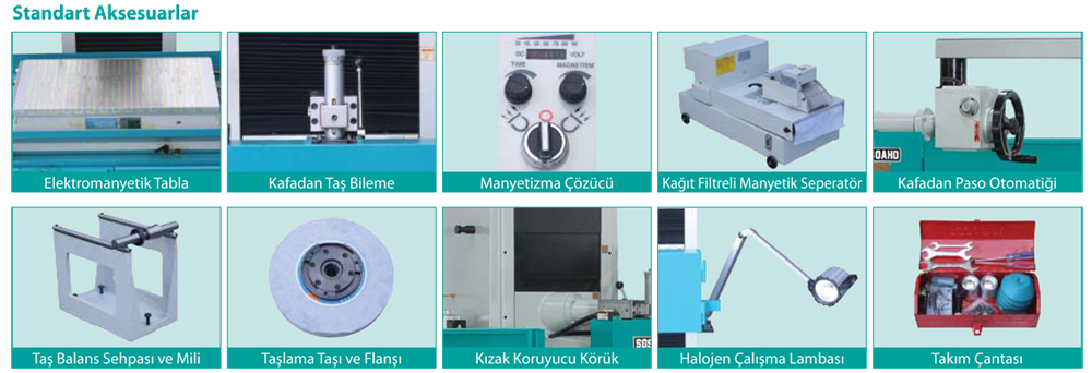 Elektromanyetik tabla, Kafadan taş bileme, Manyetizma çözücü, Kağıt filtreli manyetik seperatör, Kafadan paso otomatiği, Taş balans sehpası ve mil, Taşlama taşı ve flanşı, Kızak koruyucu körük, Halojen çalışma lambası, Takım çantası